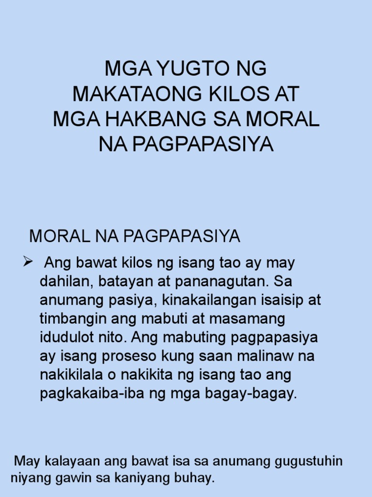 Ang bawat kilos at pasiya na kanyang gagawin ay may epekto sa kaniyang sarili at kapuwa kung kayat kailangan na ito ay isagawa nang maingat gamit ang talino na ibinigay ng Diyos. Bukod dito ang bahaging ito ang nagbibigay ng sentro o pokus sa sa isang pag-aaral. Mga Yugto ng Makataong Kilos at mga Hakbang sa Moral na PagpapasiyaMODULE 8Ang bawat kilos at pasiya na gagawin ng tao ay may epekto sa kaniyang sarili at kapuwa kung kayat kailangan na ito ay isagawa nang maingat gamit ang talino na ibinigay ng DiyosMay pagkakasunod-sunod SEQUENCE ang pagsasa- gawa ng makataong kilos.