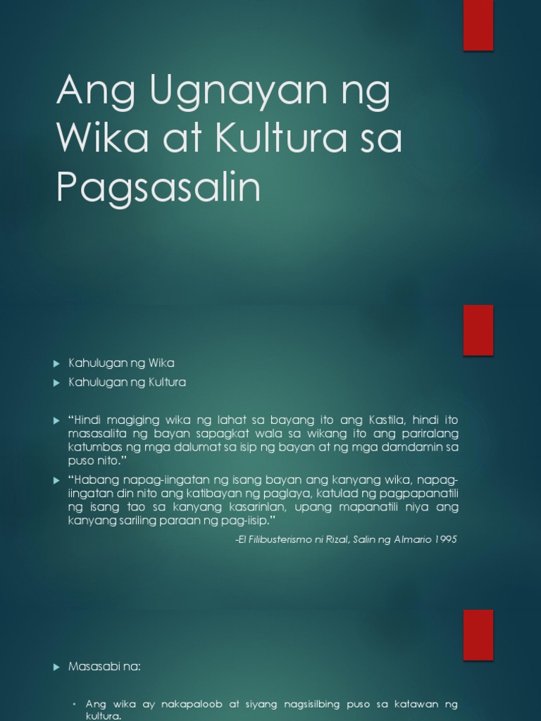 Wika at Kultura sa Pagsasalin Kahulugan ng Wika Kahulugan ng Kultura Hindi magiging wika ng lahat sa bayang ito ang Kastila hindi ito masasalita ng bayan sapagkat wala sa wikang ito ang pariralang katumbas ng mga dalumat sa isip ng bayan at ng mga damdamin sa puso nito Habang napag-iingatan ng isang bayan ang kanyang wika napag-iingatan din nito. Upang malaman ang iba pang detalye ukol sa ugnayan ng wika at kultura maaaring pumunta sa link na ito. Kultura ay siyang nagbubunsod upang ang.