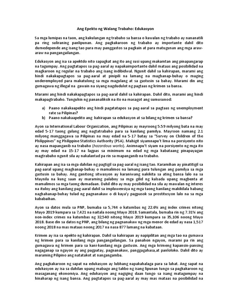 Mabutin na lamang at karamihan sa ating mga export ay nagpupunta sa East Asia Japan. Isa pa sa mga pangunahing dahilan ng kahirapan ay ang kawalan ng trabaho ng maraming PilipinoKaramihan sa mga mamamayang Pilipino ay hindi na makapasok ng trabaho dahilan na hindi nakapagtapos ng pag-aaral kahit man lamang sa estado ng sekondarya kulang sa mga gamit walang karanasan wala nang bakante at marami pang ibang dahilan ng. Tumaas ang bilang ng mga Pilipino na walang trabaho sa unang tatlong buwan o quarter ng 2018 base sa survey ng Social Weather Stations SWS na ginawa mula Marso 23-27.
