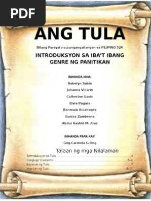 Na sa ibang pananalita ito ay isang maguniguning paglalarawan na nakakalupkupan ng kariktan sa pamamagitan ng mga sukat ng taludtod na tahasang nadarama dinaramdam iniisip o ginagawa ng tao. Ang intriga ay isang uri ng tsismis na nakasisira sa. Ang Tula o poem sa ingles ay isang uri sining o panitikan na kilala dahil sa malayang paggamit ng wika sa ibat ibang anyo at estilo.