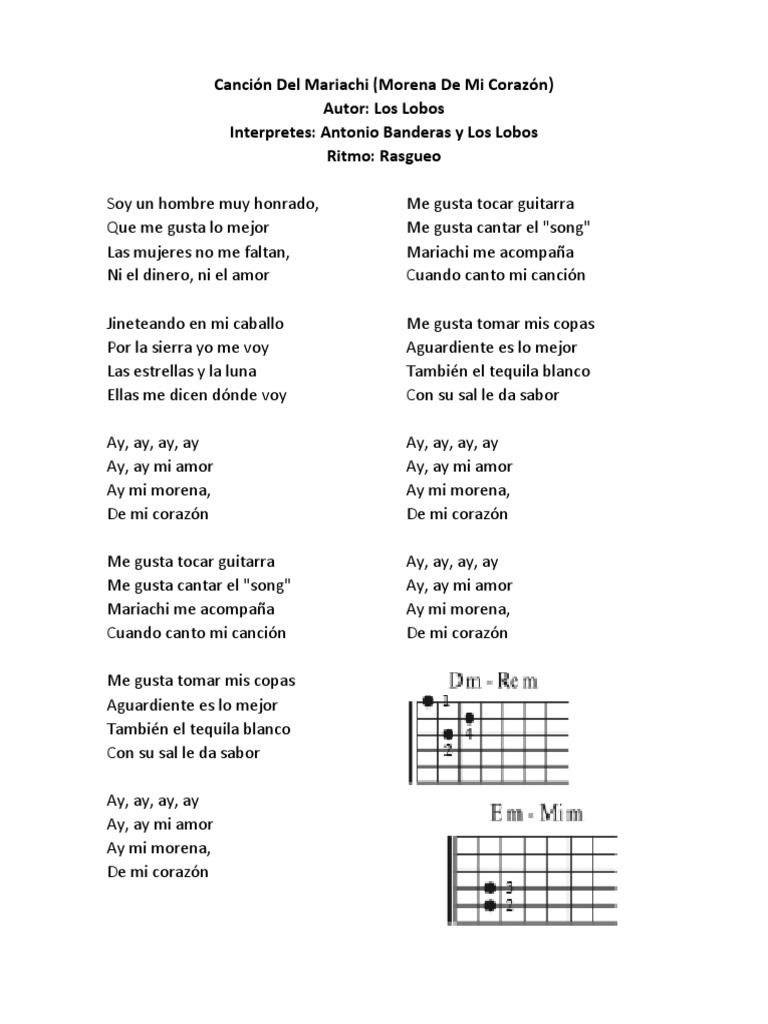Soy un hombre muy honrado Que me gusta lo mejor Las mujeres no me faltan ni el dinero ni el amor Jineteando en mi caballo Por la sierra yo me voy Las estrellas y la luna ellas me dicen donde voy Ay ay ay ay Ay ay mi amor Ay mi morena de mi corazón Me gusta tocar guitarra Me gusta cantar el son Mariachi me acompaña cuando canto mi canción Me gusta tomar mis. The mariachi plays the. View Profile View Forum Posts Private Message Junior Member Join Date Mar 2009 Thanks 0 Thanked 0 Times in 0 Posts.
